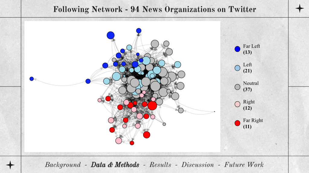 In this paper, I focus on the 94 most prominent US news organizations, and use reliability and bias data from the 2019 version of Ad Fontes Media’s Media Bias Chart. This dataset includes a reliability score (on a scale of 0-64, with 64 being the best) and bias score (on a scale of -42 to +42 with 0 being neutral, -42 being the most left-leaning, and +42 being the most right-leaning) for each organization based on individual article reviews from each. When the data was accessed in July 2020, the Ad Fontes Media dataset included 7116 total individual article reviews for articles published by 104 news organizations. Of these 104 news organizations, only 94 are used in this paper because the other 10 organizations either did not have a Twitter presence (the result of being banned or otherwise) or did not have enough article reviews in the dataset for the scores provided to be an adequate representation of the organization. I then constructed a network of these 94 news organizations based on who followed whom on Twitter as of July 2020.